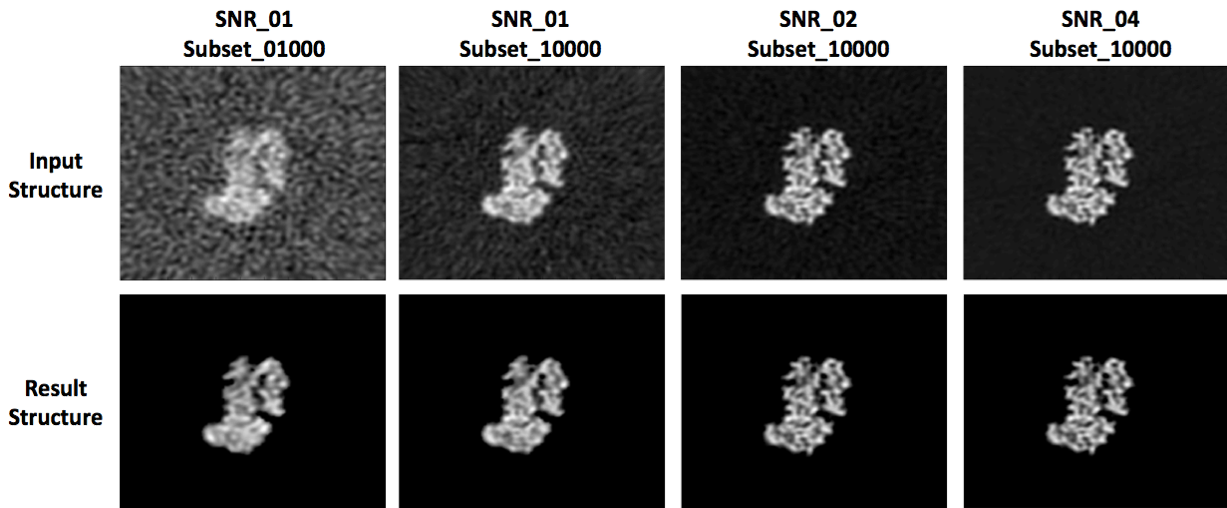 We propose an example-based electron microscopic (EM) image reconstruction framework to denoise and super-resolve real-world 3D protein structures. By exploiting prior information from the Protein Data Bank, we masked the input data using TOMOBFLOW to subtract the background. We then matched the foreground patches with the prior images by using a Nearest-neighbor algorithm and replaced them with the corresponding prior images. Finally we obtained high-resolution denoised images.