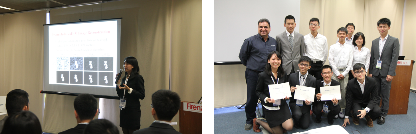 IEEE Signal Processing Cup is a competition for undergraduate students to solve real-world problems using signal processing techniques and methods. Our team NtUeLsA proposed an example-based electron microscopic (EM) image reconstruction framework to denoise and super-resolve real-world 3D protein structures. We were in the final 3, out of 95 teams worldwide, selected to participate in the final round in the Signal Processing Cup at the IEEE 2014 International Conference on Acoustics, Speech, and Signal Processing (ICASSP 2014) in Florence, Italy. I gave a 10-min presentation and answered questions for signal processing experts from the IEEE Bio Imaging and Signal Processing Technical Committee and MathWorks. Our team won Second Place.